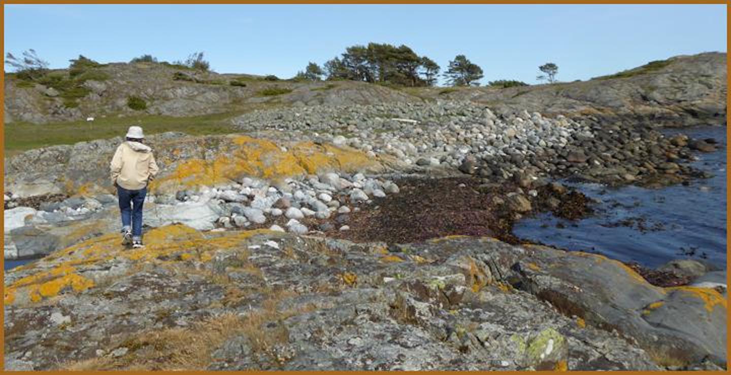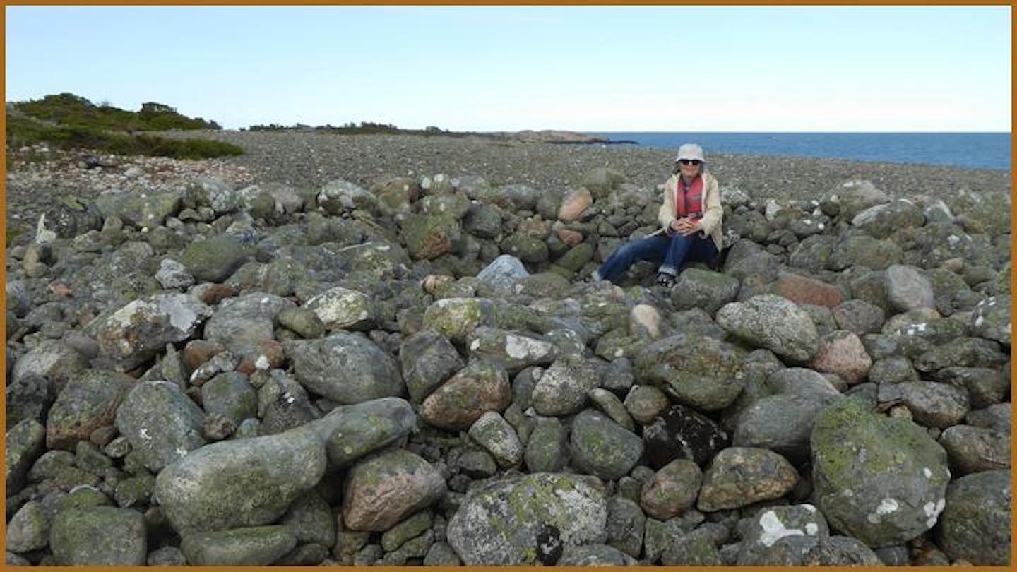 Ut mot havet er det mye stein. Tone har satt seg i ei røys som ser ut til å være lagt av mennesker som levde lenge før oss. Eller kan det være at et troll har stablet steinene?