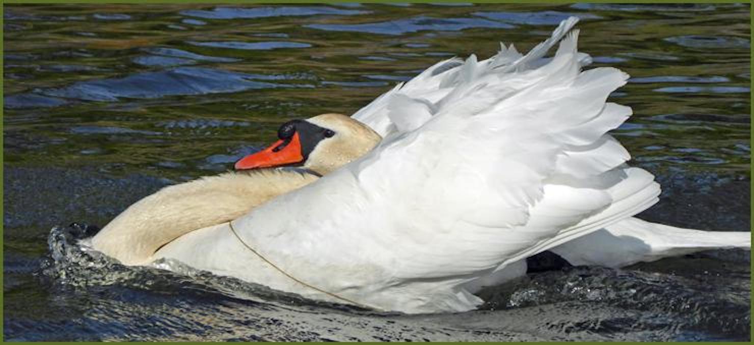 Denne svanen gjore seg skummel og farlig. Den forsøkte å skremme bort to pensjonister i hvit jolle fra sitt eneveldige territorium.