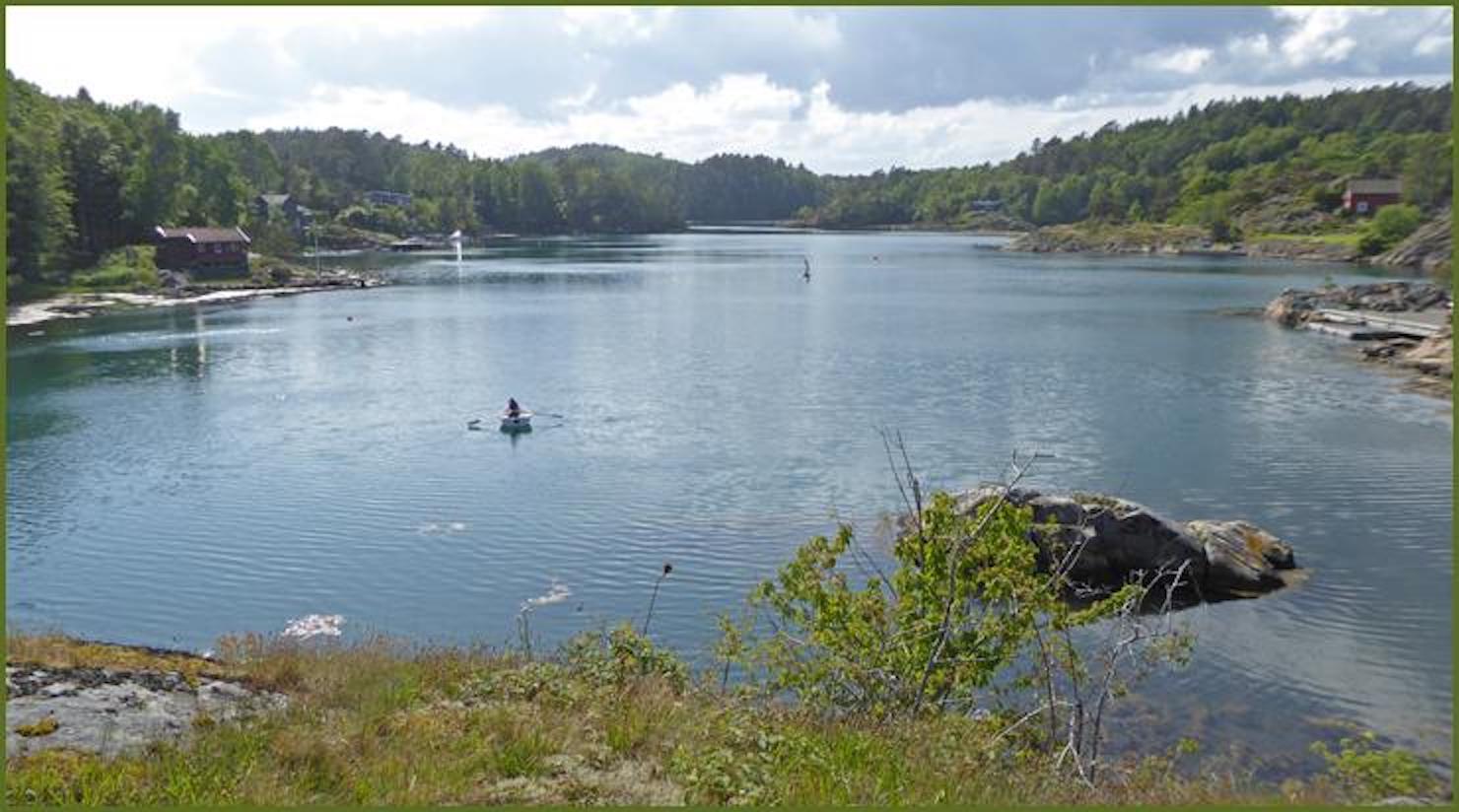 Regnet trommet på dekk da vi våknet på morgenkvisten. Regnet trommet på dekk da vi spiste vår frokost. I påvente av bedre vær leste vi i bøker vi hadde lånt på Porsgrunn bibliotek. Da det lysnet entret Tone Fjæra og lenset den for regnvann. Så rodde vi innover i Alvekilen. Innerst i kilen beitet kyr fredelig i vannkanten. Innenfor Floras ankringsplass ligger en liten holme som gjør at kilen får en insnevring. Vi observerte at deler av holmen var inngjerdet. Årsaken til dette måtte undersøkes. Finn-Erik ble satt i land for å klatre opp til gjerdet og observere det som måtte befinne seg innenfor. Midt i holmen viste det seg å være et vannfylt hull . På kartet heter holmen Gruveholmen. Nysgjerrige som vi var kontaktet vi en lokal båteier som holdt på med rengjøring av en flytebrygge. Hun fortalte oss at det en gang hadde vært gruver i kilen.